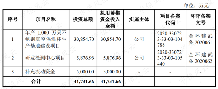 此轮IPO上市,嘉益股份拟募资4.17亿,其中3.09亿用于“年产1,000万只不锈钢真空保温杯生产基地”,计划建设周期为2年,预计建成后第3年实现100%达产。