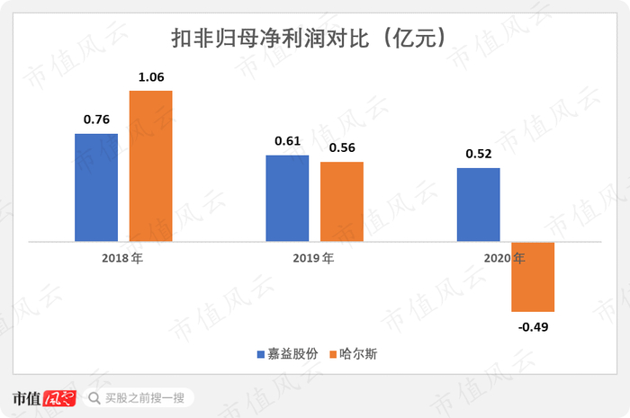 与同行业上市公司哈尔斯(002615.SZ)相比,2020年,哈尔斯以14.92亿的营收规模远超嘉益股份,但两家公司的扣非归母净利润却是颠倒过来的:公司大约为5,200万,而哈尔斯则从2018年的1.06亿快速下滑至2020年的亏损4,900万。