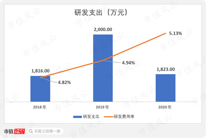 2018年至2020年,公司的研发支出分别为1,816万、2,000万和1,823万,研发费用率稳步上升,分别为4.82%、4.94%和5.13%,颇为出人意料。