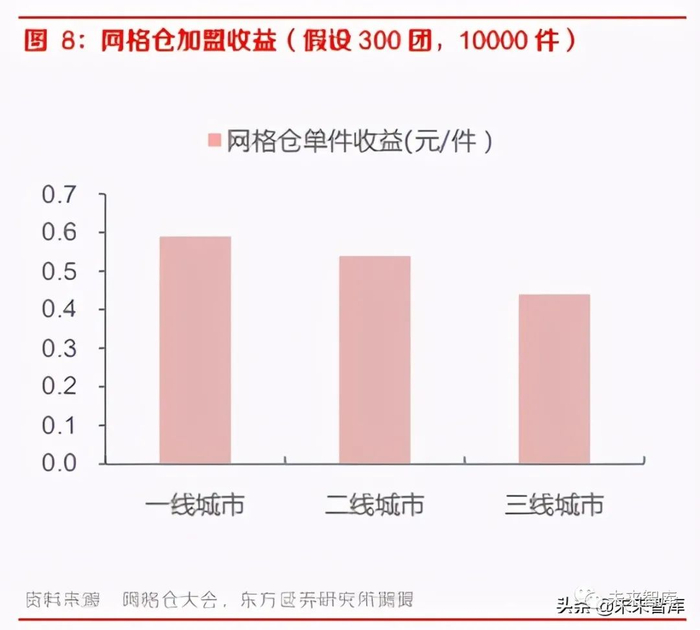 (2)有经验的专业化网格仓运营公司:如果仅做网格仓加盟商,对下游订单量及团效无法造成影 响,那唯一节省成本的方法就是精益化运营,提高运营效率,如前文所述,对于网格仓来说最大的 成本在于配送环节,曾有物流、快递、仓配经验的专业化公司更容易通过物流排线,人员调拨管理 等方式提高车辆满载率及单司机串点效率,压低成本,且未来专业化运营公司可能会跨区域跨城市 承包多仓,复用经验,有望实现盈利。