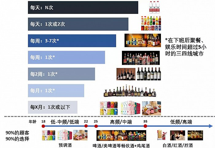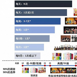 首先“后青春期”年轻人不是“时间的朋友”,25-35岁之间是酒消费最为频繁的“黄金饮酒年龄”,也具备了一定的消费能力。而喜欢调配酒的“后青春期”年轻人集中在18-22岁,处于还在读书或初出社会时的阶段,当时选择的“学生时期品牌”,在进入黄金饮酒年龄后将被迅速抛弃。