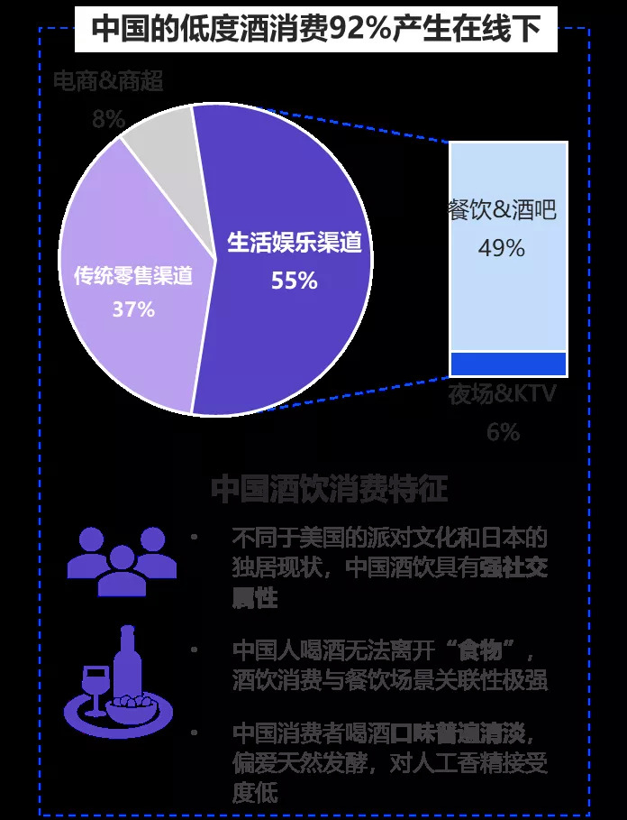 这是由中国酒类消费的特点决定的,完全不同于美国的派对文化和日本的独居消费,中国人喝酒无法离开“食物”,与餐饮场景关联性极强。对于酒精度8度以下,尤其是3.5度—5度的畅饮酒,最大的渠道是餐饮,即酒吧和餐吧。