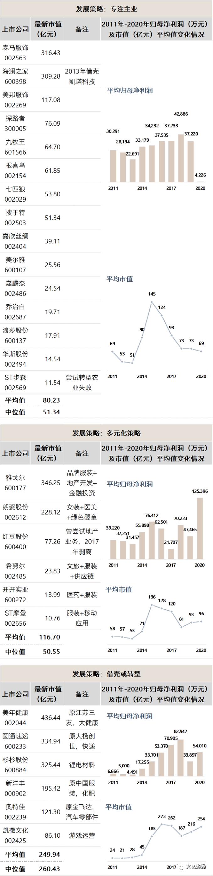 面对行业性困局,不少服装上市公司纷纷谋求转型。1996年上市的国内“服装行业第一股”杉杉股份(600884.SH)如今全面转型锂电材料供应商,残存的服装业务也于2020年被彻底剥离;拥有“裤装第一股”光环的百圆裤业自14年起先后收购环球易购、优壹电商等,转型跨境电商企业,原有的裤业业务营收贡献已不足0.5%;凯撒股份(002425.SZ)2015年收购酷牛互动、幻文科技、天上友嘉三家互联网游戏公司,转型成为网络游戏运营商;曾经背靠国务院的中国服装(000902.SZ)也早早通过借壳转型成为化肥企业,更名“新洋丰”。我们选取了2012年及以前上市的27家服装上市公司,根据其后续采取的业务发展策略分类统计了2011年至今各类上市公司的归母净利润及市值变化情况,统计结果如下: