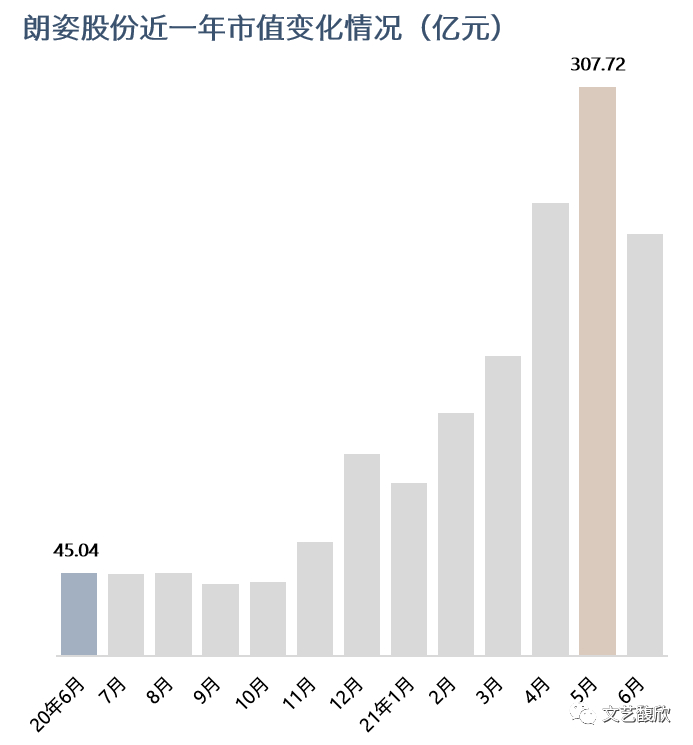2019年开始,通过对新旧业务的梳理和调整,朗姿股份逐渐确立了时尚女装、医疗美容和绿色婴童三大主业并进的战略布局。而赶上医美风口的朗姿股份自2020年11月至今,股价由10元左右增长到最高点约70元,原本市值40亿左右的小市值公司,如今已成为资本市场大热股,市值也一度高达300亿。
