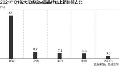 而在清洁电器里的细分品类无线吸尘器中,戴森仍然在国内市场领先,同时国产品牌集中发力,对处于头部的戴森形成合围之势。据奥维的数据,2021年一季度,戴森在国内线上无线吸尘器的销售额占比为53%,同比减少7.1个百分点;而随后的小米、美的、小狗、苏泊尔的份额分别提升3.1、2、1.4、2.4个百分点,至8.2%、7.1%、6.6%和3.6%。