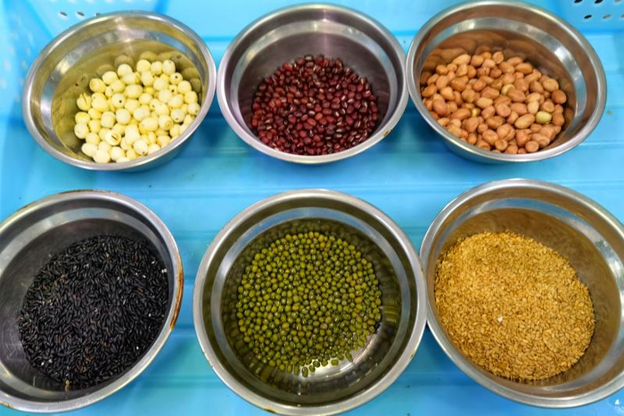 用了糯米、板栗、红豆、绿豆、黑米、花生、莲子、亚麻籽等八种食材,很有营养,也名副其实。