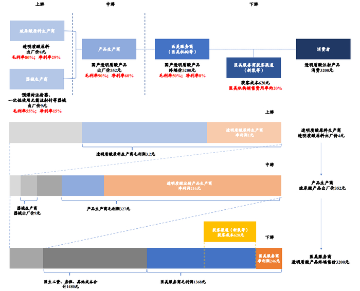 医美产业链中,产品生产商占据产业链核心利润分配环节(以透明质酸注射产品为例进行分析)