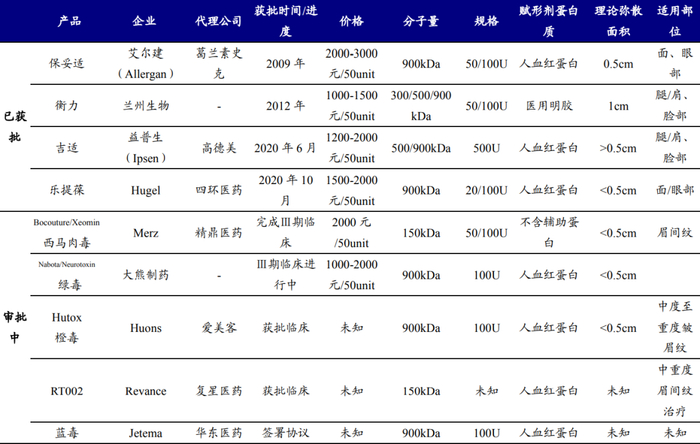 肉毒素:高频、应用场景广,终端需求旺盛。目前我国仅4款产品获批,且短期内预计合规产品仍将以该4款为主。