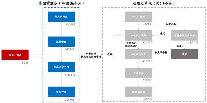 资质审批:完成临床试验后注册申报至少需要6-9个月。临床通过后,提交注册申请还需技术审批、行政审批等流程,不确定性因素多,仍需要一年左右时间。