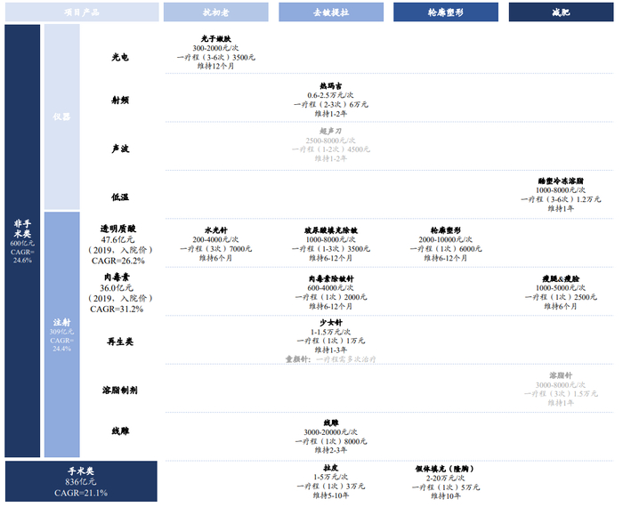 (CAGR为2015-2019年,非手术类包括仪器、注射等,标灰为暂未获批项目;相同项目不同产品价格差异较大,仅选取有代表性国货产品价格作为产品及疗程价参考)