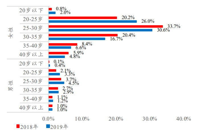 现阶段分性别、年龄结构医美渗透率的测算:已知2018年、2019年(1)我国医疗美容服务渗透率分别为1.4%/1.7%;(2)医美人群性别、年龄分布;(3)真实性别、年龄分布;基于上述数据可测得2018年、2019年分性别、年龄结构的医美渗透率。