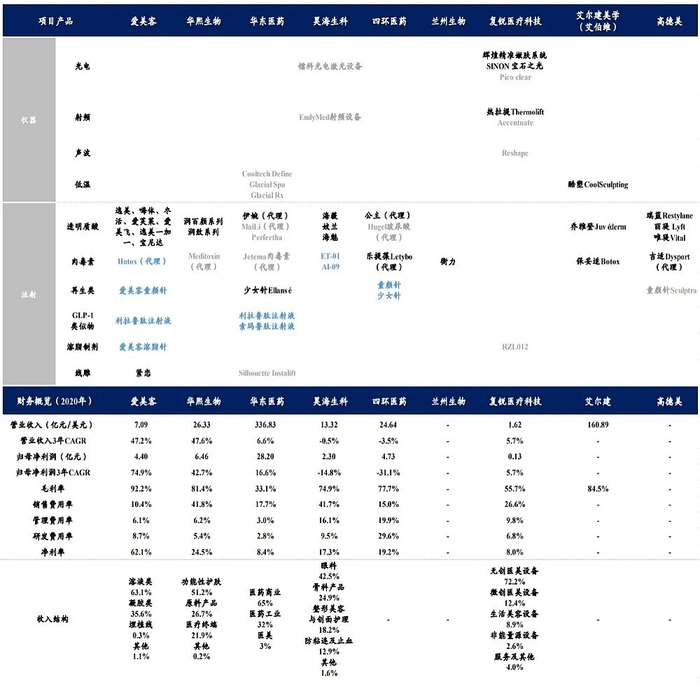 国内:爱美客、华东医药在各领域布局覆盖较广;华熙生物、昊海生科在透明质酸领域深耕;复锐医疗科技主要布局在光电领域;四环医药在肉毒素领域具有领先优势。