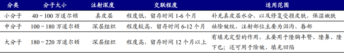 透明质酸(玻尿酸)作为重要医美产品,可实现补水、填充去皱、轮廓塑形等功效。透明质酸在人体皮肤中天然存在,是表皮和真皮层主要基质,具有吸收水分、保持湿润、防止皮肤衰老等作用,但会随年龄增长而流失。将透明质酸添加到医美产品中后,通过皮下填充剂方式即可实现对人体透明质酸的补充。从效果来看,根据分子大小不同及填充位置不同,可分别实现抗初老、填充去皱、轮廓塑形等功能。通常来讲,小分子只能注射在较浅的真皮层(水光类项目,抗衰),中分子(填充除皱)及大分子(轮廓塑形)能够注射在深层组织处。对透明质酸而言,分子越大说明交联程度越高,能够留存的时间也越长。