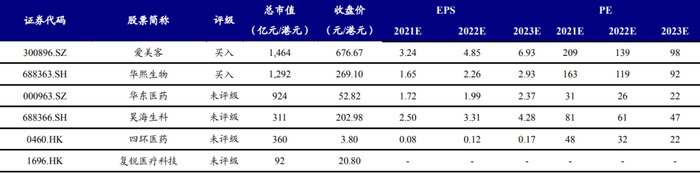 (注1:收盘价日期为2021年5月31日;注2:爱美客、华熙生物EPS为开源证券预测值,其他公司为一致预期预测值;注3:四环医药、复锐医疗科技总市值、股价和EPS单位为港币,其他公司单位为人民币)