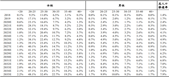 分性别、年龄结构医美渗透率:预计2030年渗透率达到6.5%