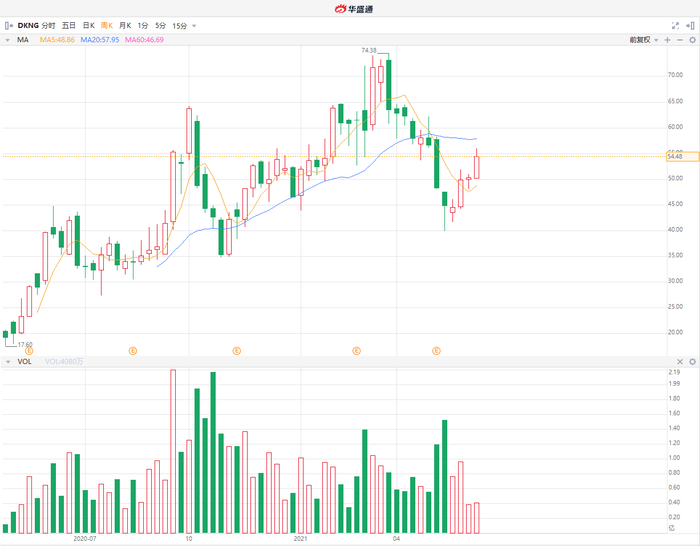 公司股价自上市以后也持续走高,近期有所回调。截至6月9日收盘,公司股价报54.48美元,市值219亿美元。随着美国合法博彩的州越来越多,加之欧洲杯带来的体育博彩热潮,DraftKings股价有望再度走高。