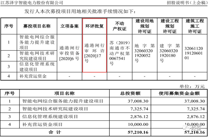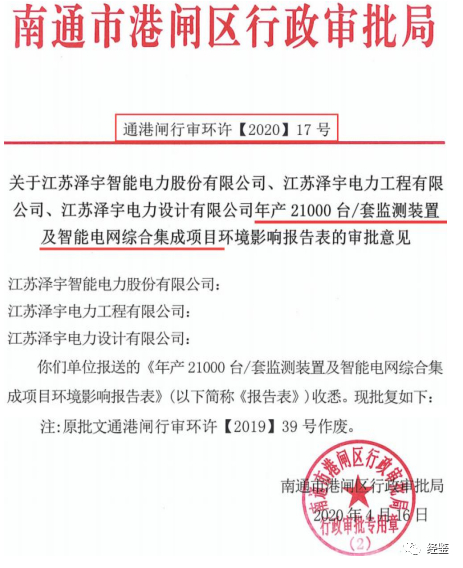 招股说明书披露,泽宇智能本次募投项目已获批准,获批环评文件为通港闸行审环许[2020]17号。据南通市港闸区行政审批局公示显示,对应该批号项目名称为“年产21000台套监测装置及智能电网综合集成项目”,项目总投资为10亿元。