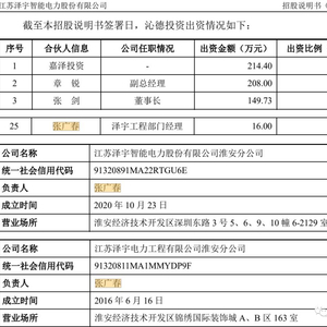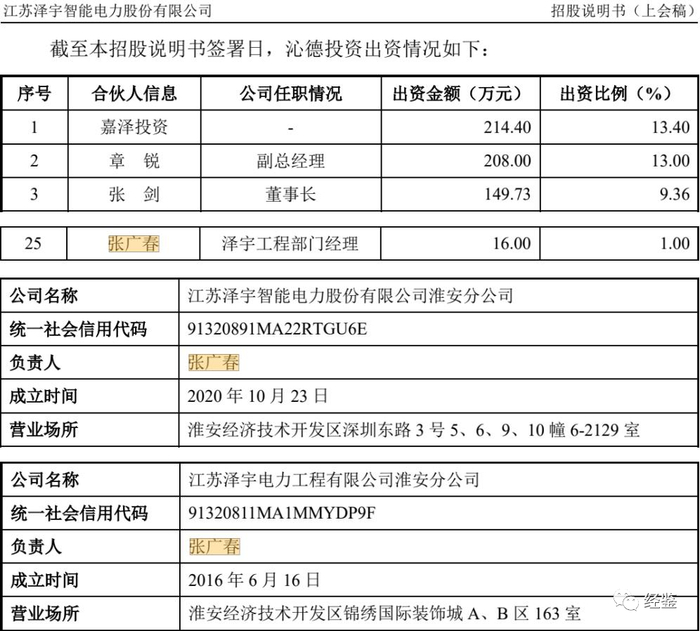 据招股说明书披露,张广春为泽宇智能员工持股平台沁德有限合伙人之一,出资比例1%,并同时担任泽宇智能淮安分公司、泽宇工程淮安分公司的法定代表人。