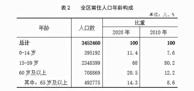 全区常住人口中,0-14岁[5]人口为395192人,占11.4%;15-59岁人口为2348399人,占68%;60岁及以上人口为708869人,占20.5%,其中65岁及以上人口为492775人,占14.3%。