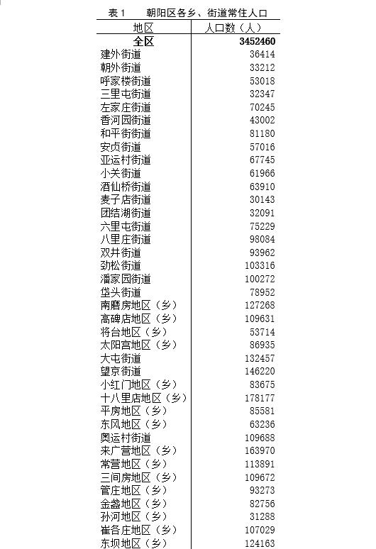 全区43个乡、街道中,常住人口在10万人以上的有13个,分别是十八里店地区(乡)、来广营地区(乡)、望京街道、大屯街道、南磨房地区(乡)、东坝地区(乡)、常营地区(乡)、奥运村街道、三间房地区(乡)、高碑店地区(乡)、崔各庄地区(乡)、劲松街道和潘家园街道;在5万人-10万人之间的有21个,分别是八里庄街道、双井街道、管庄地区(乡)、太阳宫地区(乡)、平房地区(乡)、小红门地区(乡)、金盏地区(乡)、和平街街道、垡头街道、六里屯街道、左家庄街道、亚运村街道、酒仙桥街道、东风地区(乡)、东湖街道、小关街道、安贞街道、王四营地区(乡)、豆各庄地区(乡)、将台地区(乡)和呼家楼街道;在5万人以下的有9个,分别是黑庄户地区(乡)、香河园街道、建外街道、朝外街道、三里屯街道、团结湖街道、孙河地区(乡)、麦子店街道和首都机场街道。