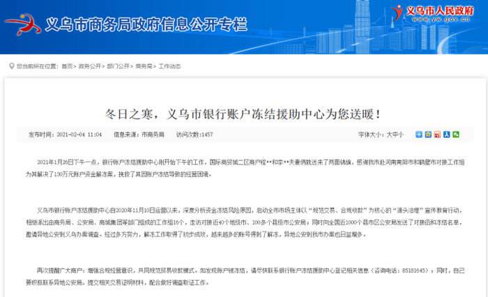 义乌市商务局为此还专门发布了公告,协助当地商户解冻银行账户。