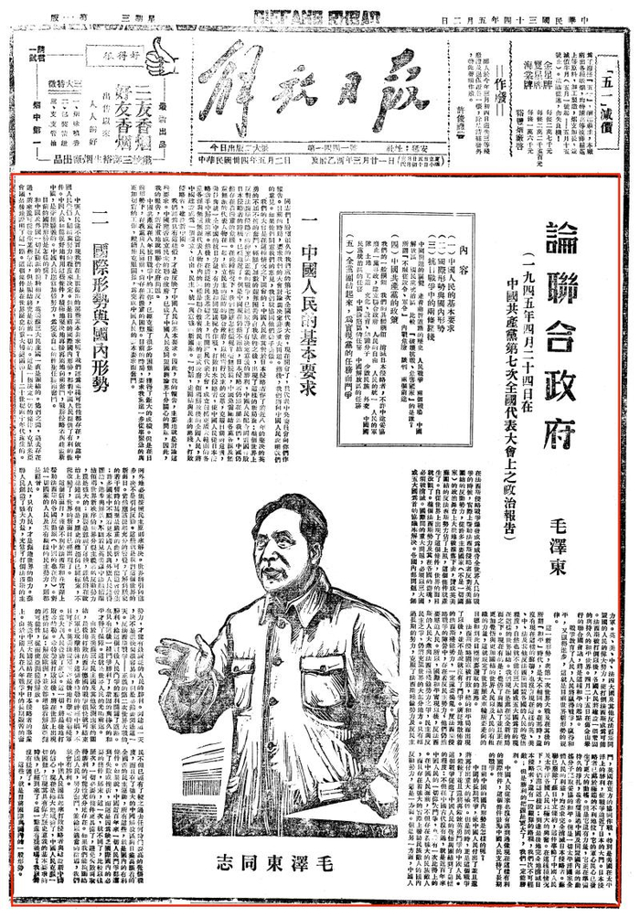 1945年5月2日,《解放日报》以连续六个版,全文刊发了毛泽东在中国共产党第七次全国代表大会上的政治报告。