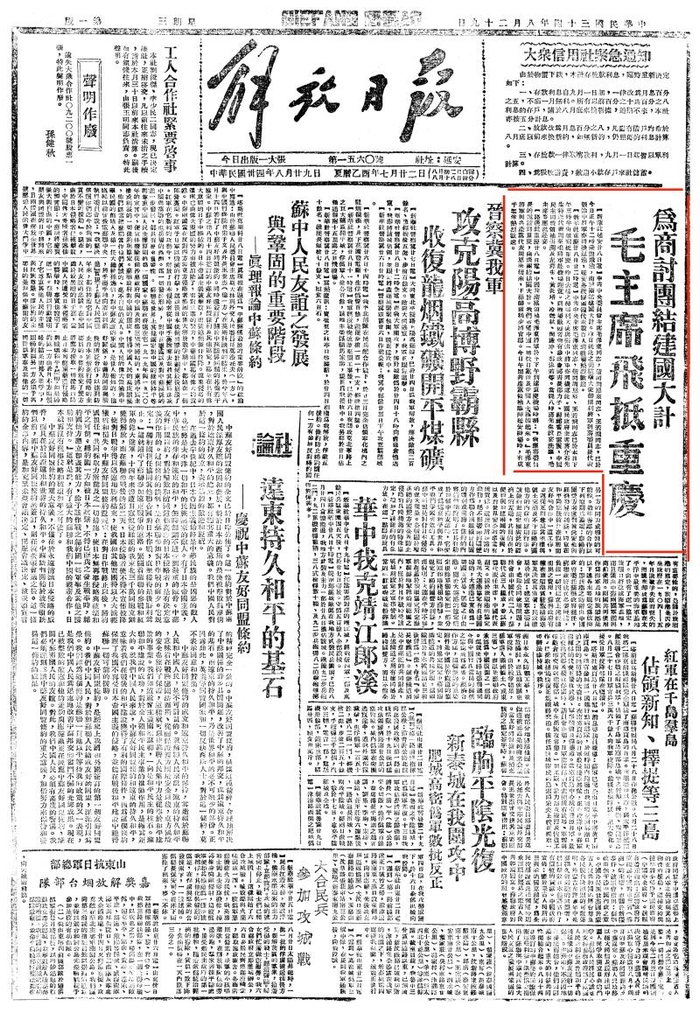 【路透社重庆廿八日电】中国共产党领袖毛泽东将军于今下午到达重庆机场时称:“我应蒋委员长的邀请到重庆,商谈团结建国大计。我们希望中国一切抗日党派及爱国人士团结起来。”毛泽东将军与共产党代表周恩来偕来,下榻赫尔利少将官邸。今日午间共产党领袖离开延安机场时,有成千群众热烈欢送。