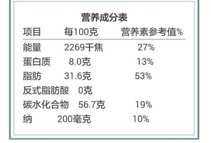 比如根据营养成分表,100克食物热量为500千卡,吃上100克可能就抵上了一顿正餐的热量,而如果吃掉400克,你今天一天的热量就超标了,肯定会发胖。