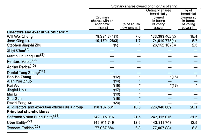 招股书显示,在上市前,滴滴所有董事和高级管理人员持股比例合计10.5%,投票权20.1%。