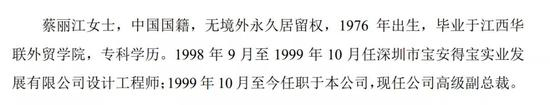 而蔡华波的姐姐蔡丽江与弟弟同年出生,为公司早期创始人,目前任公司高级副总裁。蔡丽江的学历比蔡华波高一些,其毕业于江西华联外贸学院(现名“江西外贸专修学院”)。