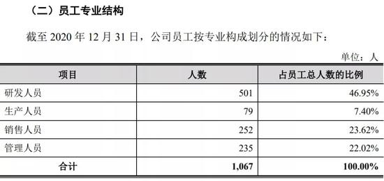 截至2020年底,公司共拥有员工1067人,其中研发人员占比近半。