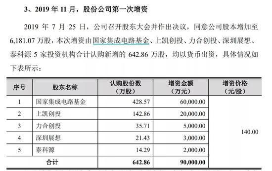 据招股说明披露,2019年7月25日,江波龙召开股东大会并作出决议,同意公司股本增加至6181.07万股,本次增资由国家集成电路基金、上凯创投、力合创投、深圳展想、泰科源5家投资机构合计认购新增的642.86万股,均以货币出资。