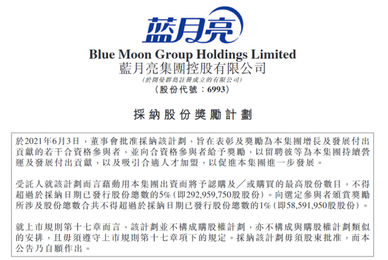 在敲响港交所上市的大钟半年后,蓝月亮集团发布公告称,经董事会批准拟采用集团资金对员工进行股权激励,将认购或购买股份不超过于采纳日期已发行股份总数的5%(即292,959,750股),向选定参与者颁赏奖励所涉及股份总数不超过于采纳日期已发行股份总数的1%(即58,591,950股)。