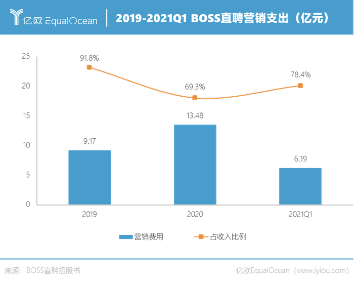 招股书数据显示,2019年、2020年和2021年一季度BOSS直聘的营销支出分别为9.17亿元、13.48亿元和6.19亿元,占收入的比重分别为91.8%、69.3%和78.4%。