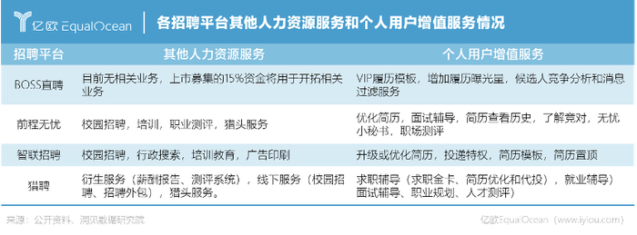 除了直接对B端企业主的招聘需求进行年费套餐销售收费外,大多在线招聘平台还会提供其他的人力资源服务和个人用户增值服务。比如前程无忧、智联招聘、猎聘均有校园招聘服务,前程无忧和猎聘有猎头服务。