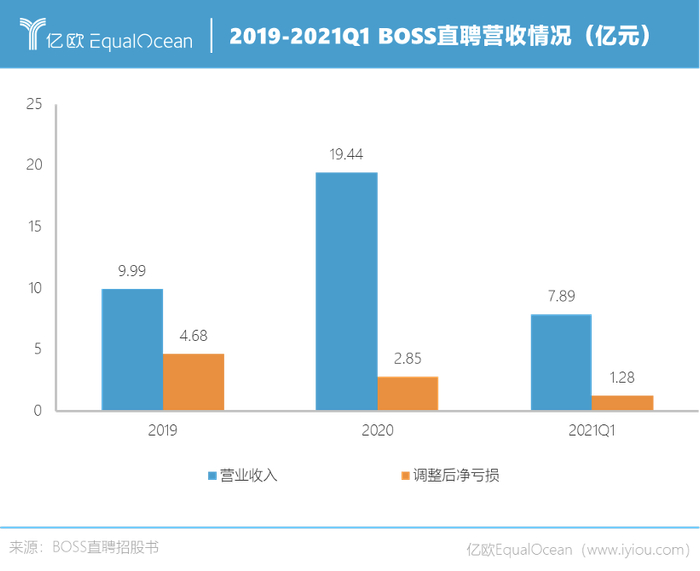最新招股书显示,2019年、2020年、2021年一季度,BOSS直聘的营业收入分别为9.99亿元、19.44亿元和7.9亿元;同期,经调整净亏损分别为4.68亿元、2.85亿元和1.28亿元。