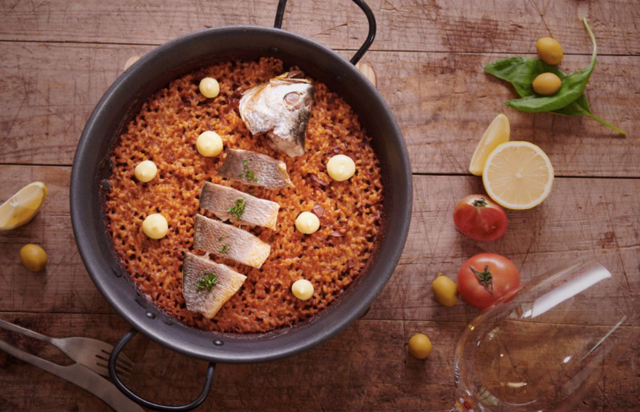 说到马德里版本的“卤煮”,充满奇思妙想,源自马德里非常有名的Callos a la Madrilena——用牛肚、牛蹄、猪蹄、西班牙火腿等十余种食材,采用传统方法烹制,在低温下慢煮数小时。遵循传统之余,主厨巧妙地把传统的鹰嘴豆换成了油豆腐,让美味升级。源于瓦伦西亚的西班牙大锅饭,不仅是一道菜,更是一种文化传承。主厨独创的招牌菜大黄鱼paella,鲜甜是主旋律,这道菜采用西班牙传统做法,整条大黄鱼和大虾、鱿鱼、扇贝等海鲜的鲜味完全融入饭中。