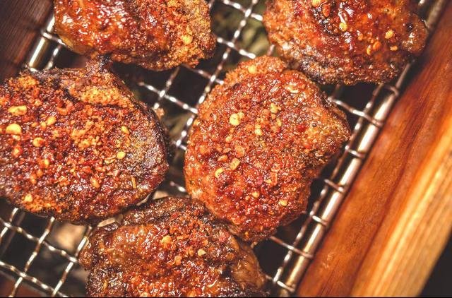 烟熏盒子系列是Suzy酒家自创的招牌菜,其中,烟熏迷迭香鲜羊腰盒子,将现宰的新鲜羊腰用炭火慢慢烤制后,放入迷迭香熏炙的木质盒子,一打开盒子,香气扑鼻。配上主厨用多种辣椒配制成的辣椒面,有一种吃进阶版烧烤的快乐。当然,如果不吃羊腰,也可以选择牛肉,同样做法,同样好吃。