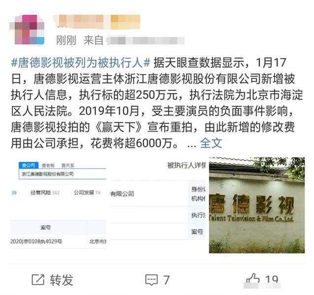 刚刚了解到,1月17日,唐德影视运营主体浙江唐德影视有限公司新增了执行人信息,执行目标突破250万元。#唐德影视被列为执行人#