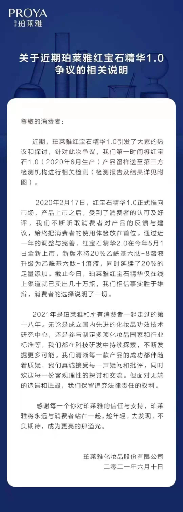 6月10日21点16分,珀莱雅在其官方微博发布了《关于近期珀莱雅红宝石精华1.0争议的相关说明》和珀莱雅赋能鲜颜淡纹紧致精华液(以下简称珀莱雅红宝石精华)检测报告。表示面对无端的造谣和诋毁,保留追求法律权限的责任。