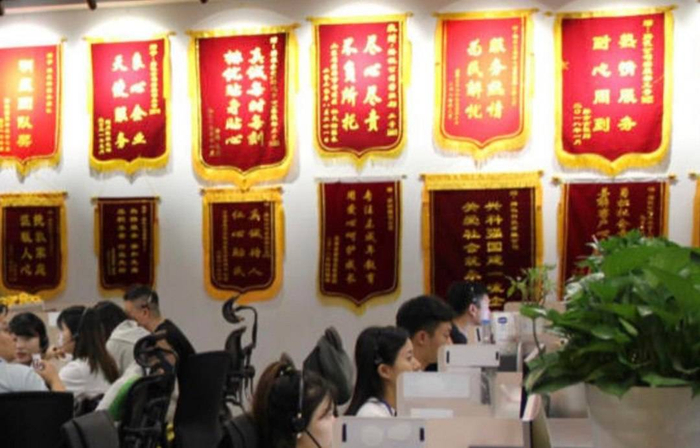 更魔幻的是,在工位旁边,我看到了一面挂满了锦旗的墙壁:「兴科强国建一流企业,关爱社会筑永世丰碑」、「为民解忧恩深似海,关爱备至胜似亲人」……这些词和游戏公司有什么关系?