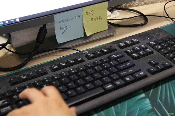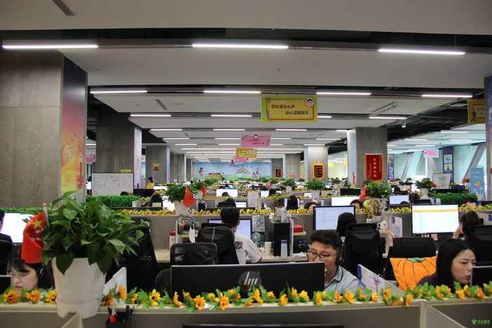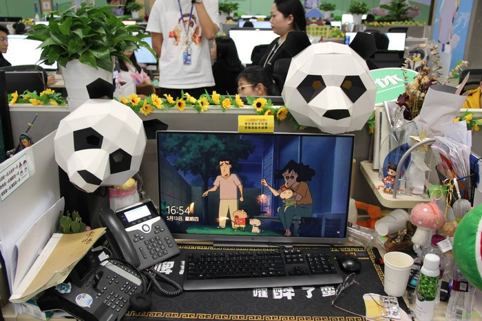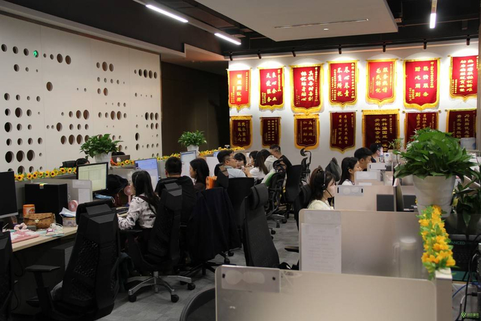 这是一间几百人的办公室,天花板上的吊牌上写着「一个小小的善举,点亮孩子的人生」之类的标语。环顾四周,所有人都是一副「鼓足力气加油干」的景象。最里面工位的温度似乎要比茶水间高上3-5度,旁边的客服看到我一直在流汗,主动递来了一包纸巾。