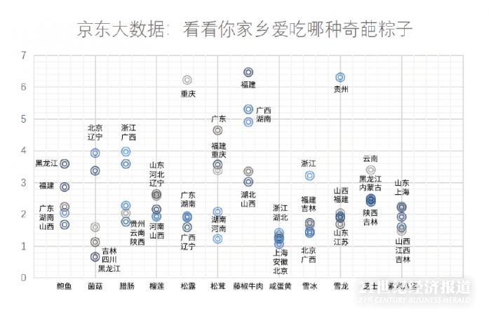 根据京东大数据研究院近日发布的2021端午消费数据及全国粽子口味偏好地图,虽然猪肉、红枣、豆沙、蛋黄等依然是粽子馅的主力军,但已经没有什么可以阻挡吃货们把任何东西放进粽子里了——辣白菜、五花肉、意式肉酱、广式腊肠、茉莉芝心、紫米八宝、藤椒牛肉、鲍鱼松露、松茸松露、榴莲、雪龙、菌菇、鳗鱼……只有想不到,没有吃不到。