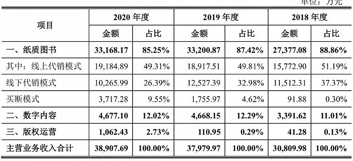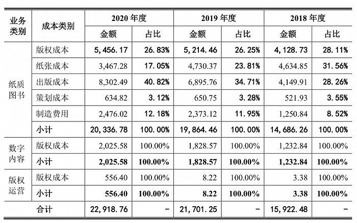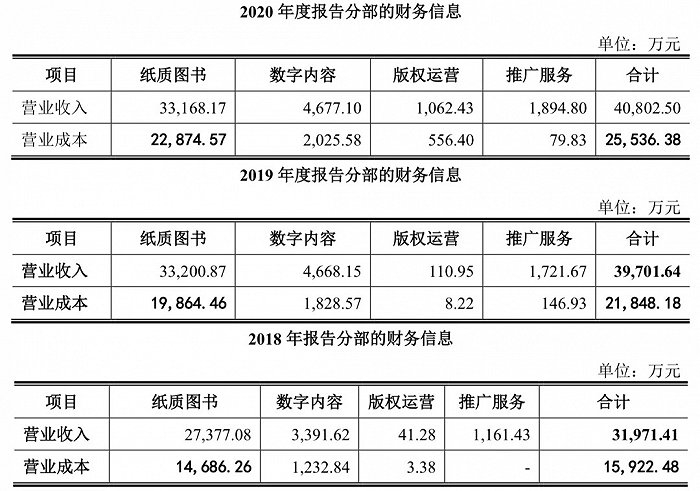 2018-2020年,纸质图书业务、数字内容业务、版权运营业务和推广服务的营业收入分别为33168.17万元、4677.1万元、1062.43万元和1894.8万元;成本分别为22875.57万元、2025.58万元、556.4万元和79.83万元。