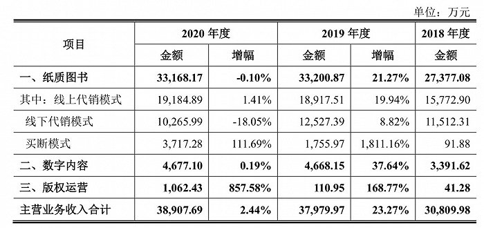 从收入构成上看,公司主营业务包括纸质图书、数字内容和版权运营,这三个业务的收入在总营收中的占比接近95%。2018 年、2019 年及2020 年度的同比增长率分别为19.17%、23.27%和 2.44%。