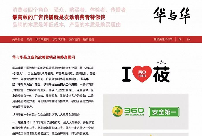 在华与华的网站上,陈列着360(安全第一)、西贝(闭着眼睛点,道道都好吃)、汉庭(爱干净,住汉庭)、黄金酒(送长辈,黄金酒)等案例。