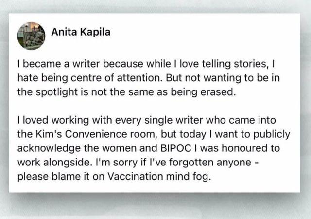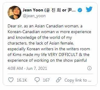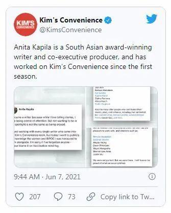 就在尹真姬发推文的数小时后,《金氏便利店》官方推特账户贴了一篇“南亚获奖作家兼联合执行制片人”安妮塔·卡皮拉(Anita Kapila)在社交媒体上发布的帖子截图。她算间接回应了有关该剧幕后缺乏代表性的说法,“我喜欢与《金氏便利店》的每一位编剧共事,但今天我想特别提一下一起共事的女同胞和BIPOC(黑人、原住民和有色人种)……”