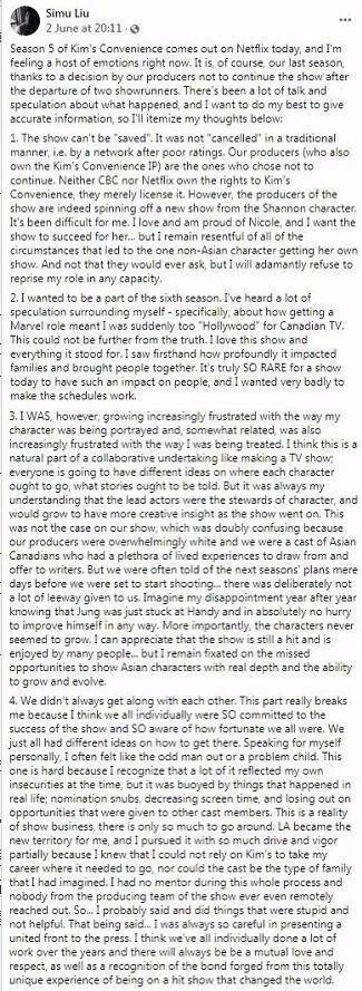 在《名利场》10日独家发布的刘思慕后续声明中,他进一步解释说自己从未打算在脸书上点名谁,并感谢这部剧让他“找到了自己的声音,塑造了现在拥有的视角和平台”。刘思慕也肯定了《金氏便利店》关注移民的重大意义: