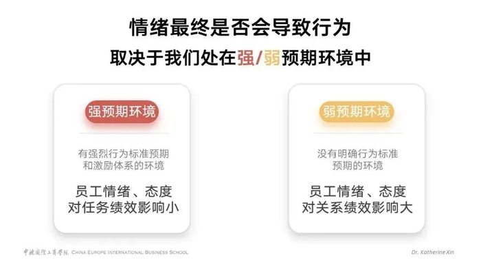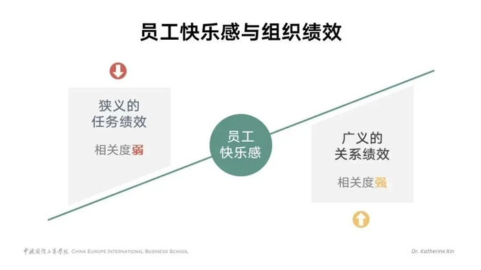 从组织绩效的类型上来看,对于狭义的、有着明确目标的任务绩效,员工的快乐情绪与之相关度并不是特别高,因为员工处在强预期环境下,岗位职责、该做的事情定义清晰,他没有太多的自主空间去做决定,情绪对任务绩效的影响就比较小。