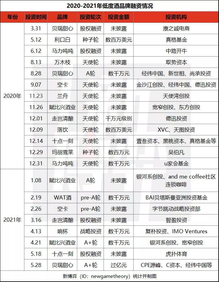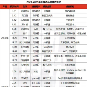 从贝瑞甜心获得融资到可口可乐推出低度酒,种种迹象均表明低度酒市场再度迎来火热,据新博弈不完全统计,2020年至今,低度酒赛道已完成21轮融资。